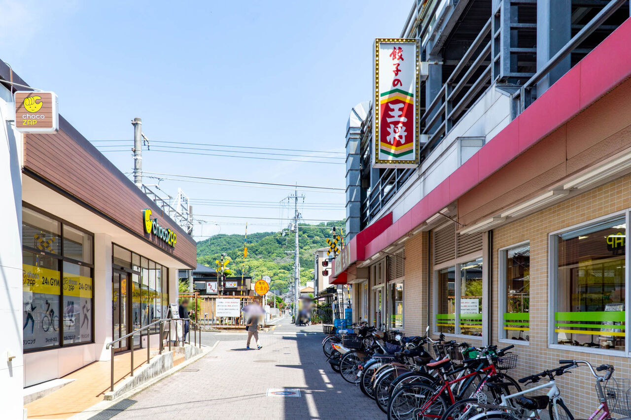 向かいには餃子の王将。こっちに行って踏切を超え右に行くと、四条畷駅の方面。
