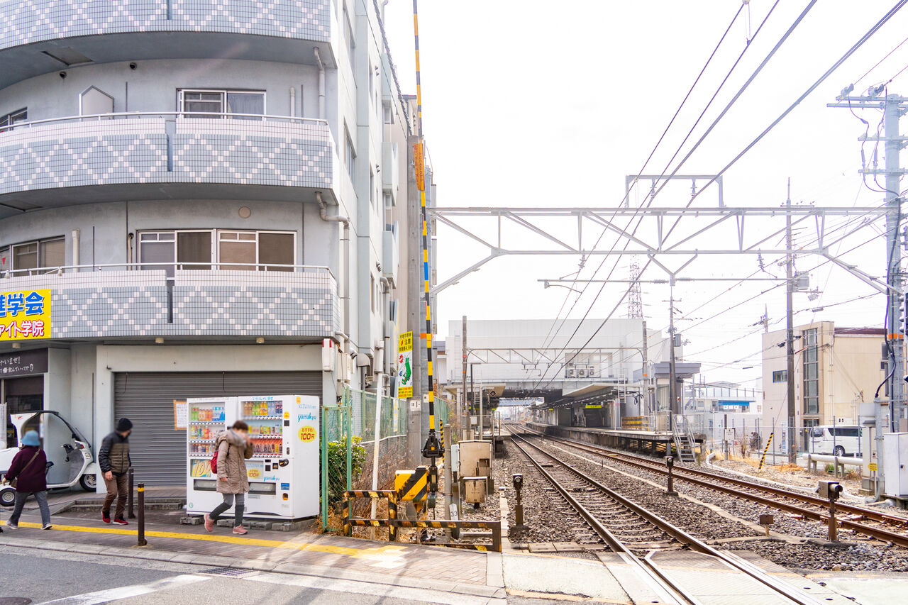 左が店舗で右奥が野崎駅。駅前の立地です。
