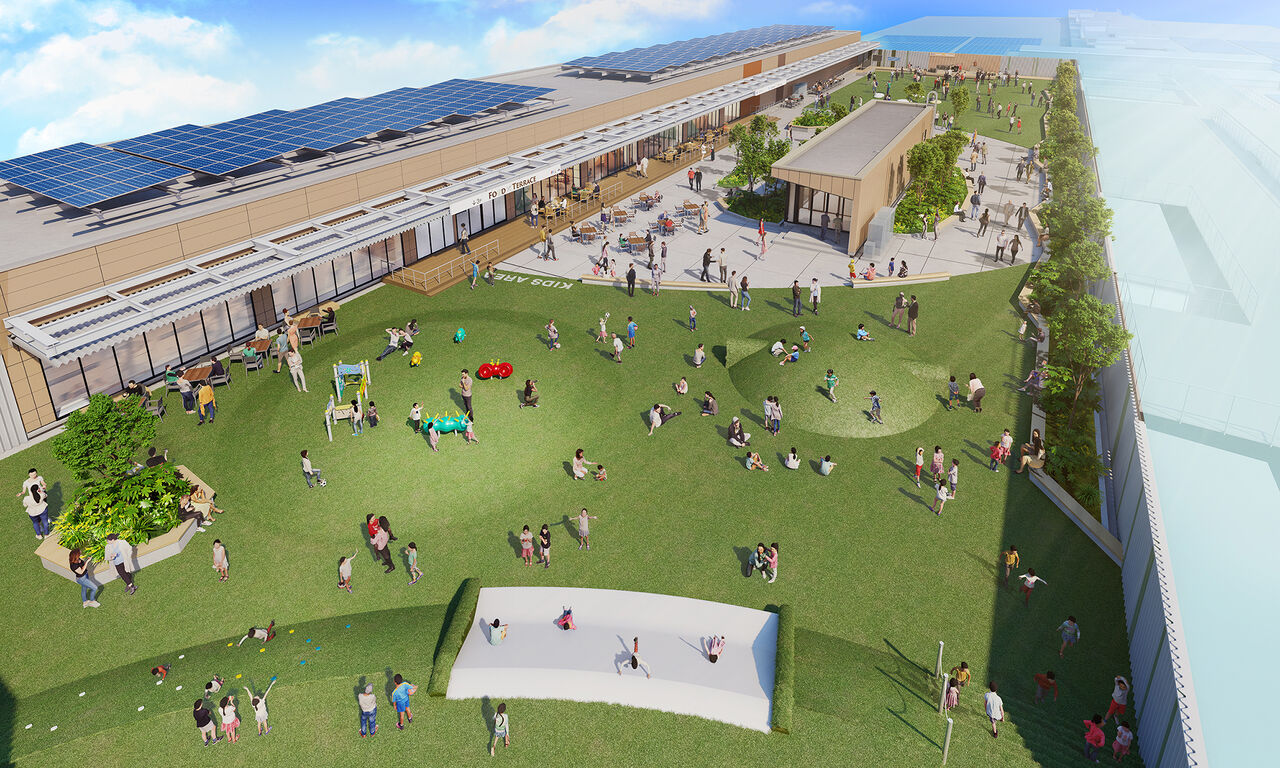 「空の広場」では南側に大型すべり台や築山トンネル、キッズ用ボルタリングや複数の遊具があるそう。そして真ん中部分がカフェコーナー。北側がステージなどの多目的広場。なんかいろんな用途が想像できて楽しいですね!