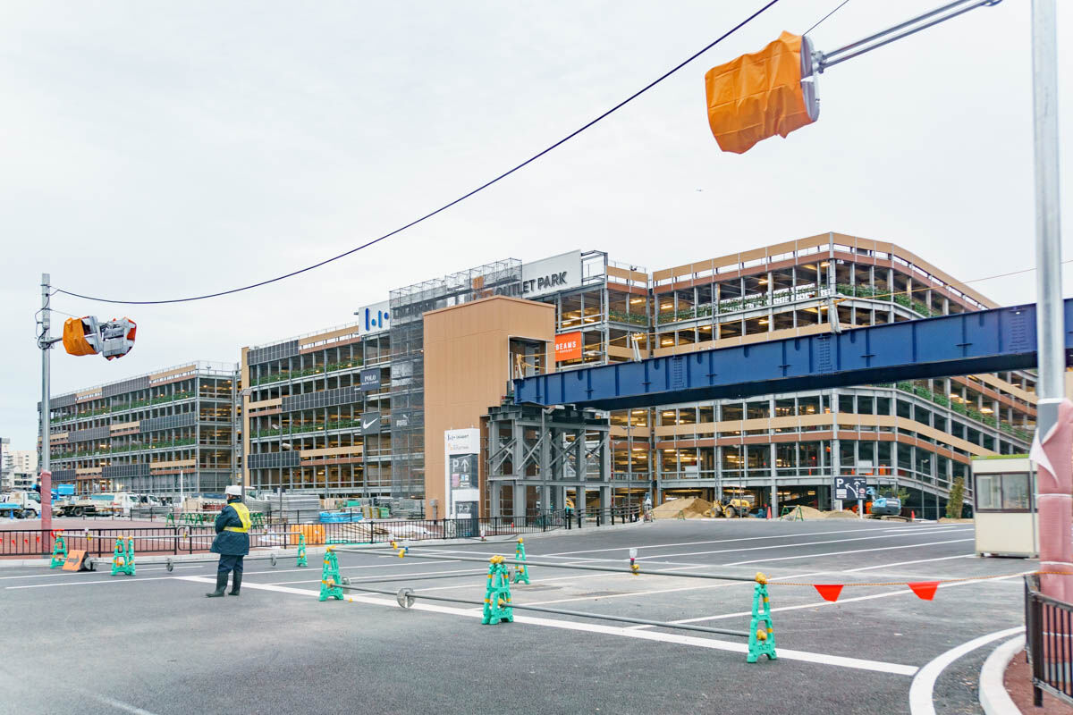もうちょっと進みまして中央環状線側の立体駐車場。ここはまだ一部足場が残っていました。