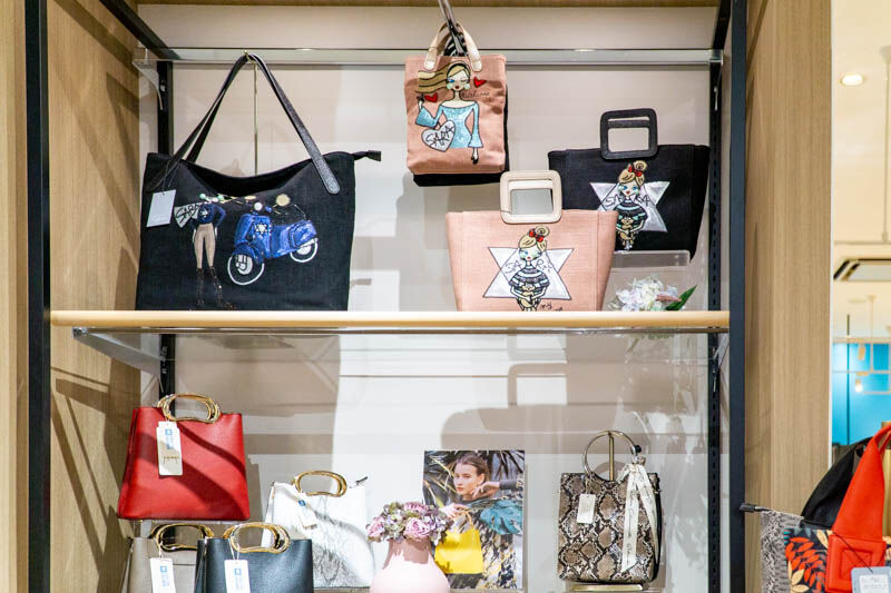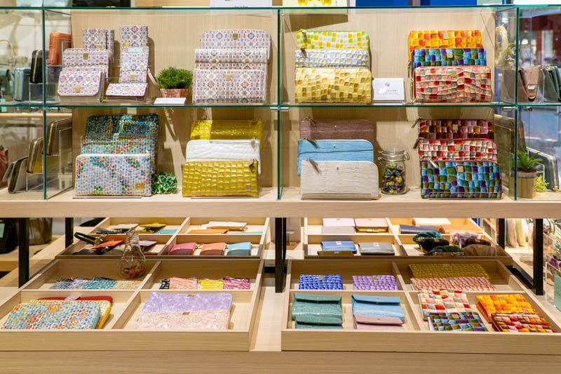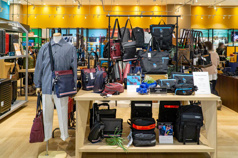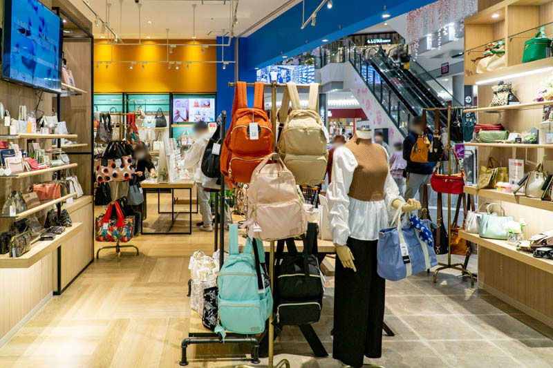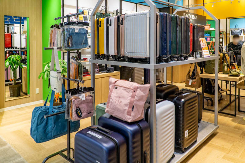 「サックスバーモノアイ」はかばん、スーツケースを中心に財布や小物雑貨などを取り扱うお店で、ここイオンモール四條畷が全国初の店舗なんだそう。