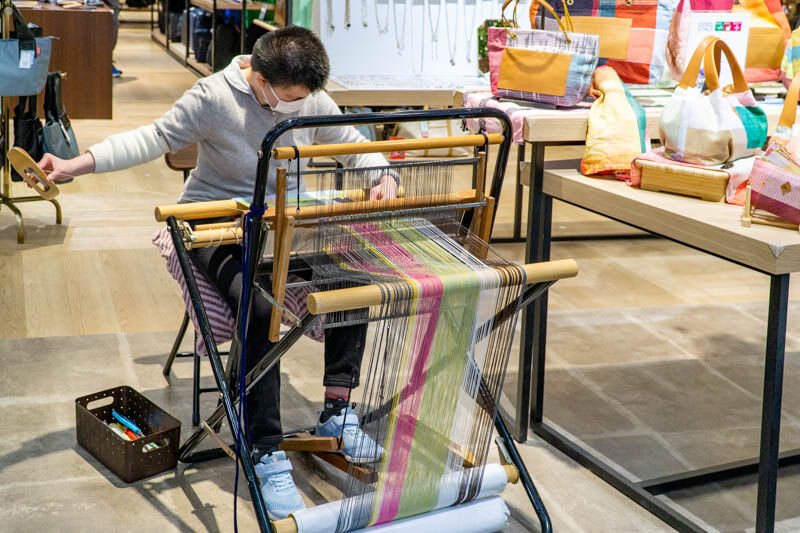 こちらは、店頭で機織りの一種である「さをり織り」を実演している様子です。この生地は『kissora』というバッグの原材料になるそう。