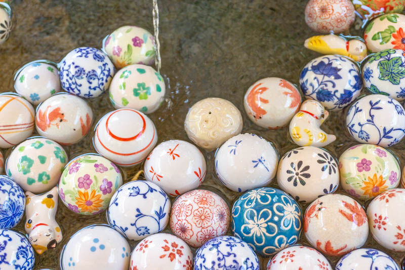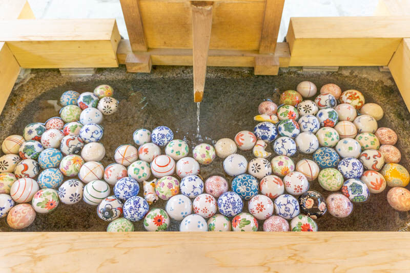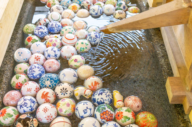 手水舎にお花が浮かんでいるのは見たことがありますが、浮き玉が浮かんでいるのは珍しいのではないでしょうか〜。