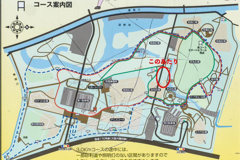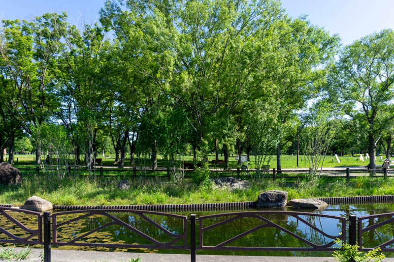 バスケット広場に背を向けると、池の先に芝生広場があります。
