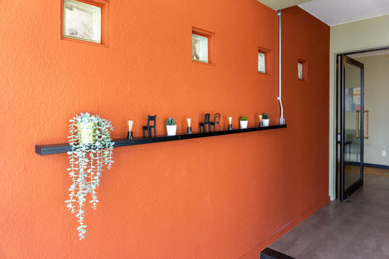 ビビットな壁の色に飾りが可愛いおしゃれな玄関。